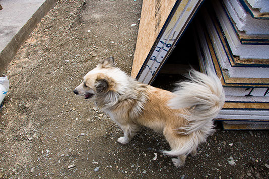 Our dog Foxy & the wall panels . . . Nuestra mascota y los paneles estructurales.