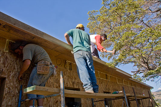 On top of the rafters, more panels . . . Los paneles van encima de las vigas.